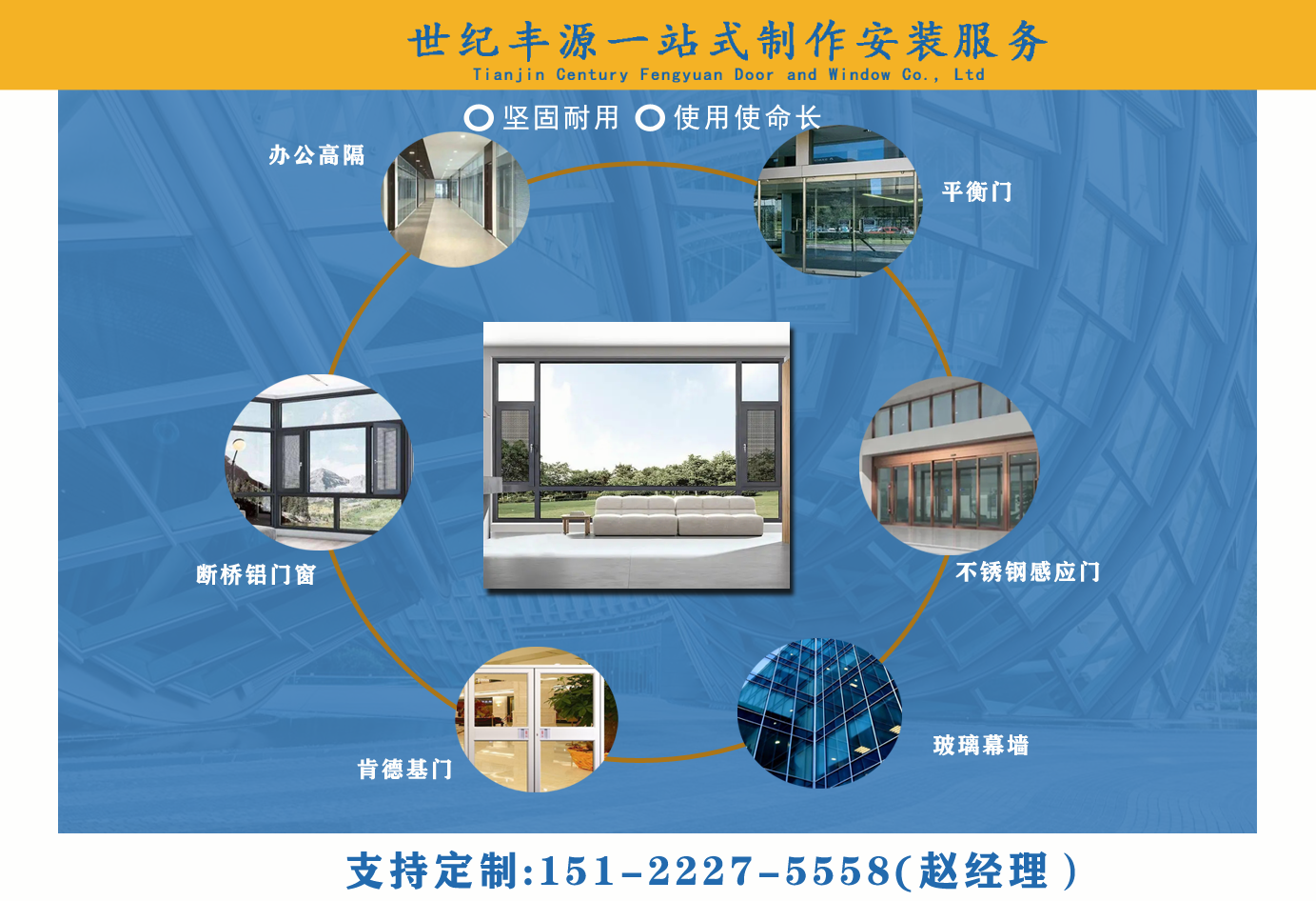 天津世紀(jì)豐源門窗有限公司從事斷橋鋁門窗,玻璃幕墻,平衡門,肯德基門,不銹鋼感應(yīng)門,百葉窗,辦公高隔,制作安裝一站式訂制生產(chǎn)及配套服務(wù)等。 公司自成立以來,始終堅持以人才為本、誠信立業(yè)的經(jīng)營原則,薈萃業(yè)界精英,成熟的技術(shù)、管理方法及企業(yè)經(jīng)驗與國內(nèi)企業(yè)的具體實際相結(jié)合,為企業(yè)供給各個方面的解決方案,使企業(yè)在激烈的市場競爭中始終堅持競爭力,實現(xiàn)企業(yè)快速、穩(wěn)定地發(fā)展。 質(zhì)量好、服務(wù)好、才能信譽好,公司已在諸多領(lǐng)域取得輝煌成績,愿意成為您可信賴的長期合作伙伴。 讓我們攜手同行,共同實現(xiàn)“讓普通老百姓都用得上高端門窗”...